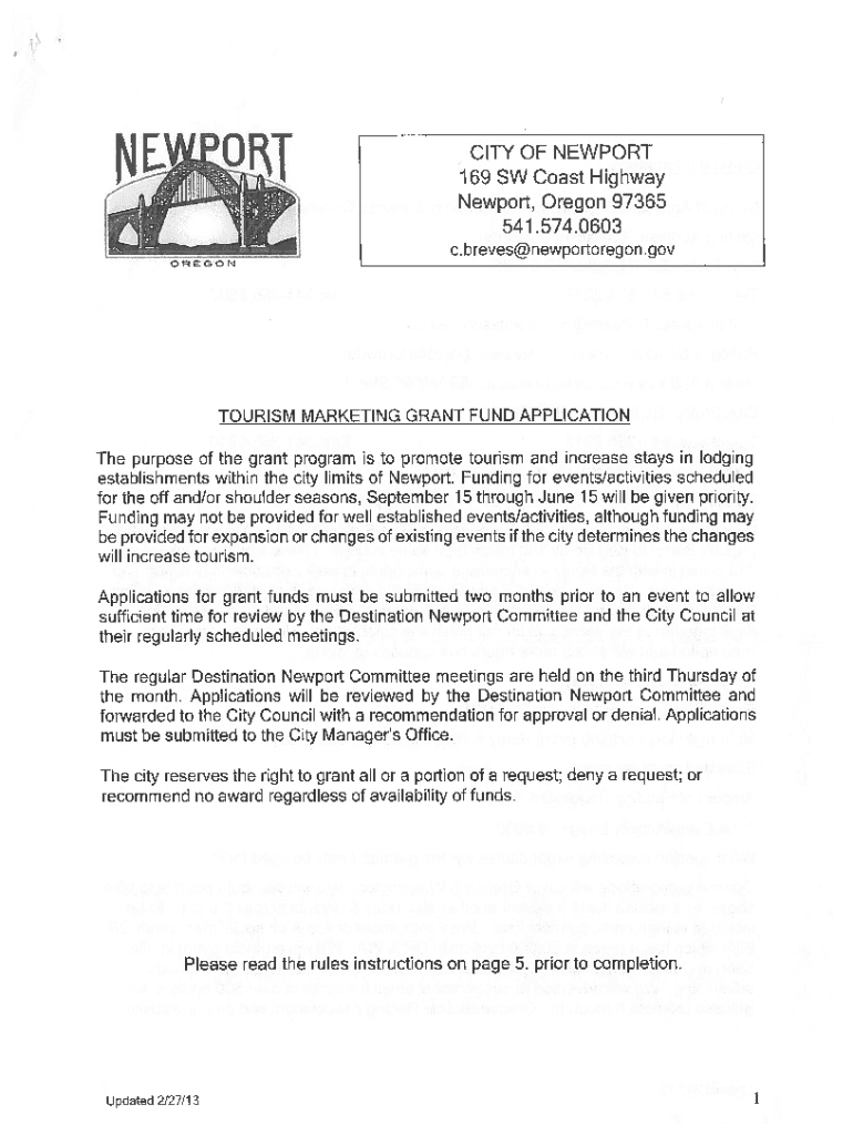 NE.WEOFJCITY OF NEWPORT 169 Coast Highway New, Oregon 97365 541.574.0603 C. brevesnewportoregon.govOREGONTOURISM MARKETING GRANT FUND APPLICATION The purpose of the grant program is to promote tourism