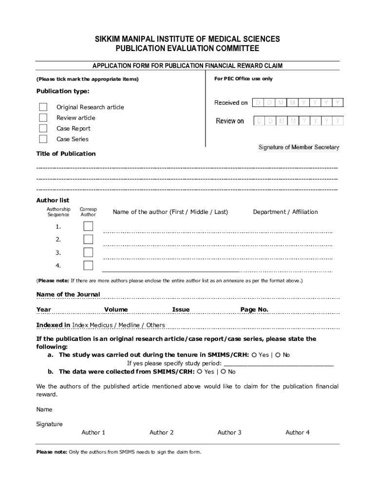SIKKIM ANIMAL INSTITUTE OF MEDICAL SCIENCES PUBLICATION EVALUATION COMMITTEE APPLICATION FORM FOR PUBLICATION FINANCIAL REWARD CLAIM For PEC Office use only(Please tick mark the appropriate items)Publication