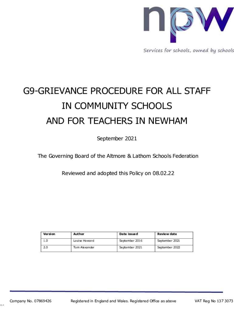 26G9GRIEVANCE PROCEDURE FOR ALL STAFF IN COMMUNITY SCHOOLS AND FOR TEACHERS IN NEWMAN September 2021 The Governing Board of the Alt more & Latham Schools Federation Reviewed and adopted this Policy