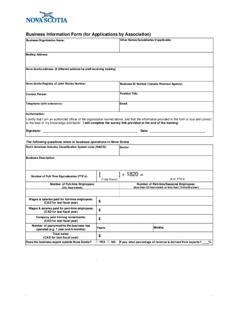 Business Information Form (for Applications by Association) Other Names/Subsidiaries if applicable:Business/Organization Name:Mailing Address:Nova Scotia address: (if different address for staff receiving