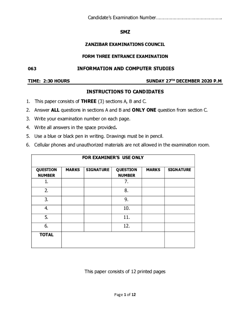 Candidates Examination Number. SMS ZANZIBAR EXAMINATIONS COUNCIL FORM THREE ENTRANCE EXAMINATIONINFORMATION AND COMPUTER STUDIES063 TIME: 2:30 HOURSSUNDAY 27TH DECEMBER 2020 P.INSTRUCTIONS TO CANDIDATES