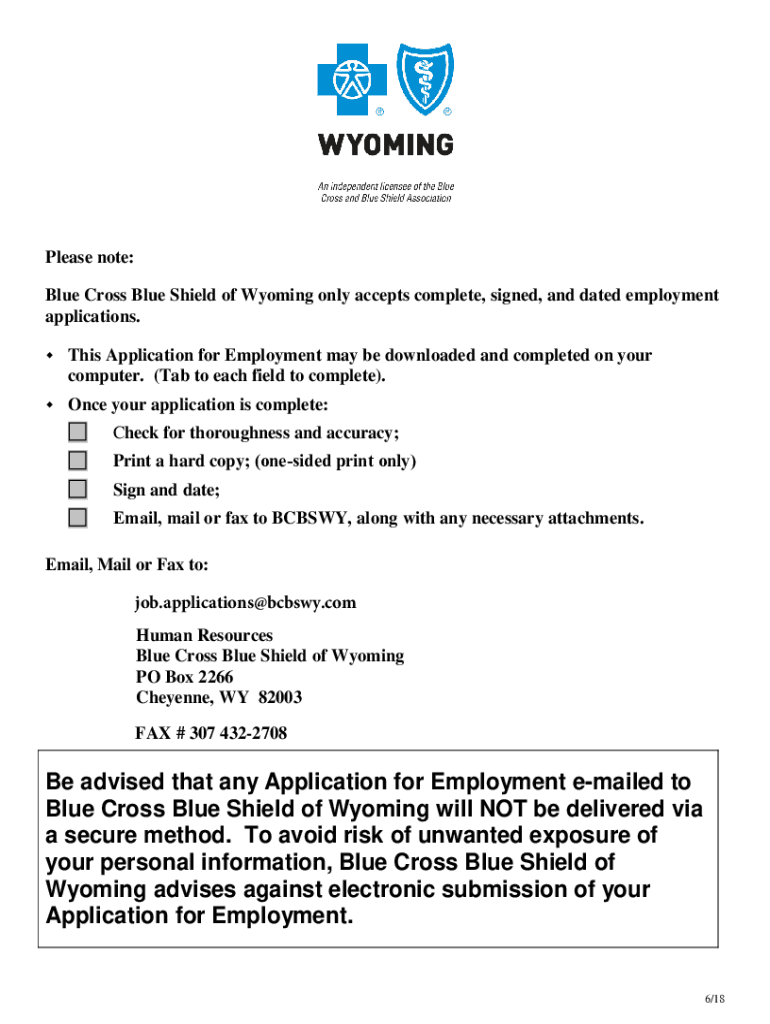 Please note: Blue Cross Blue Shield of Wyoming only accepts complete, signed, and dated employment applications. This Application for Employment may be downloaded and completed on your computer. (Tab