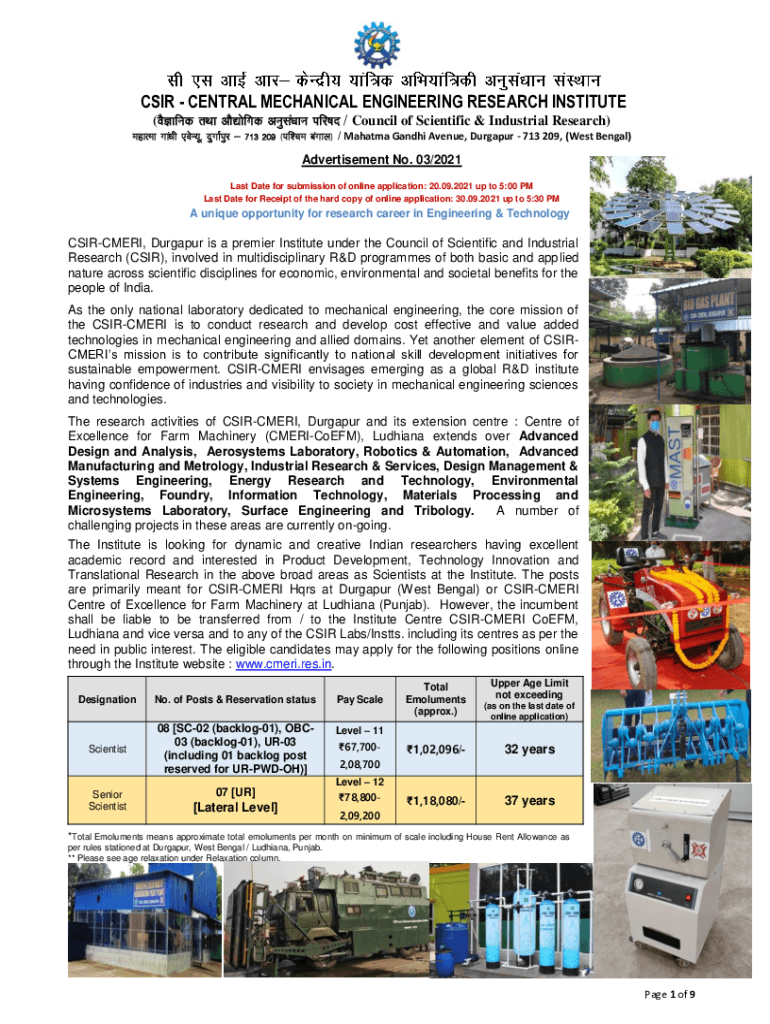 SIR CENTRAL MECHANICAL ENGINEERING RESEARCH INSTITUTE (oSKkfud FKK vs|SFX full/a SKU if\” kn / Council of Scientific & Industrial Research) egret aka/km, OSU;w] nqxkZiqj & 713 209 (IFP carry) /