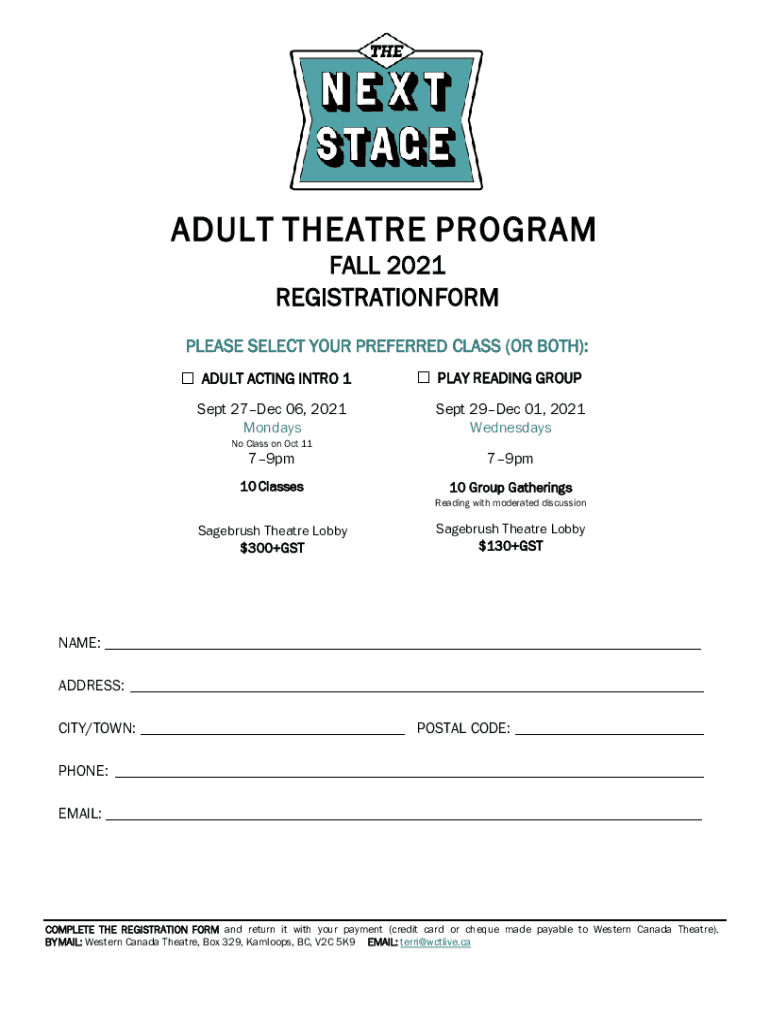 ADULT Theater PROGRAM FALL 2021 REGISTRATION FORMULAS SELECT YOUR PREFERRED CLASS (OR BOTH): ADULT ACTING INTRO 1 Sept 27Dec 06, 2021 Mondays No Class on Oct 1179pm10 Classes PLAY READING GROUP Sept