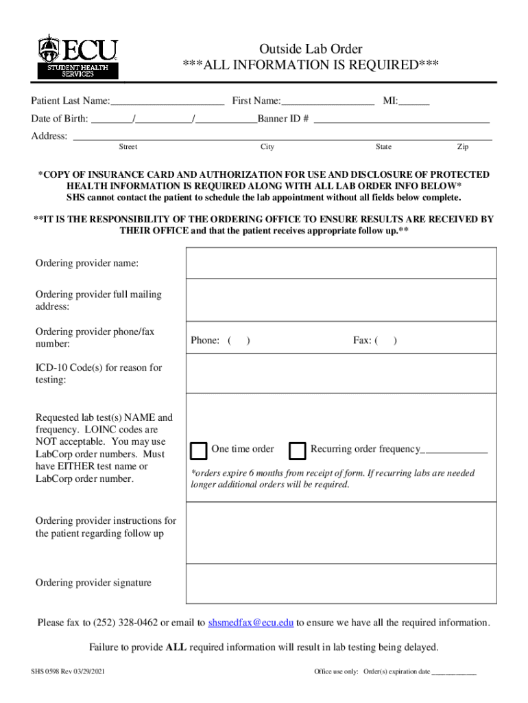 Outside Lab Order ***ALL INFORMATION IS REQUIRED*** Patient Last Name:___ First Name:___ MI:___ Date of Birth: ___/___/___Banner ID # ___ Address: ___ StreetCityStateZip×COPY OF INSURANCE CARD AND
