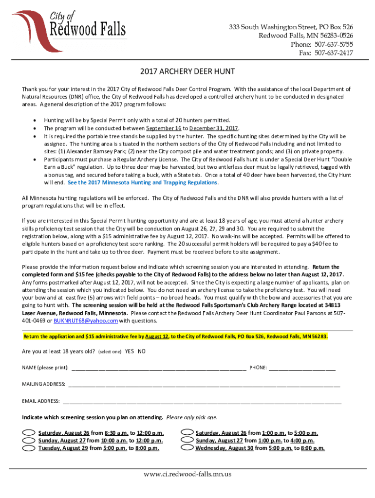 333 South Washington Street, PO Box 526 Redwood Falls, MN 562830526 Phone: 5076375755 Fax: 50763724172017 ARCHERY DEER HUNT Thank you for your interest in the 2017 City of Redwood Falls Deer Control