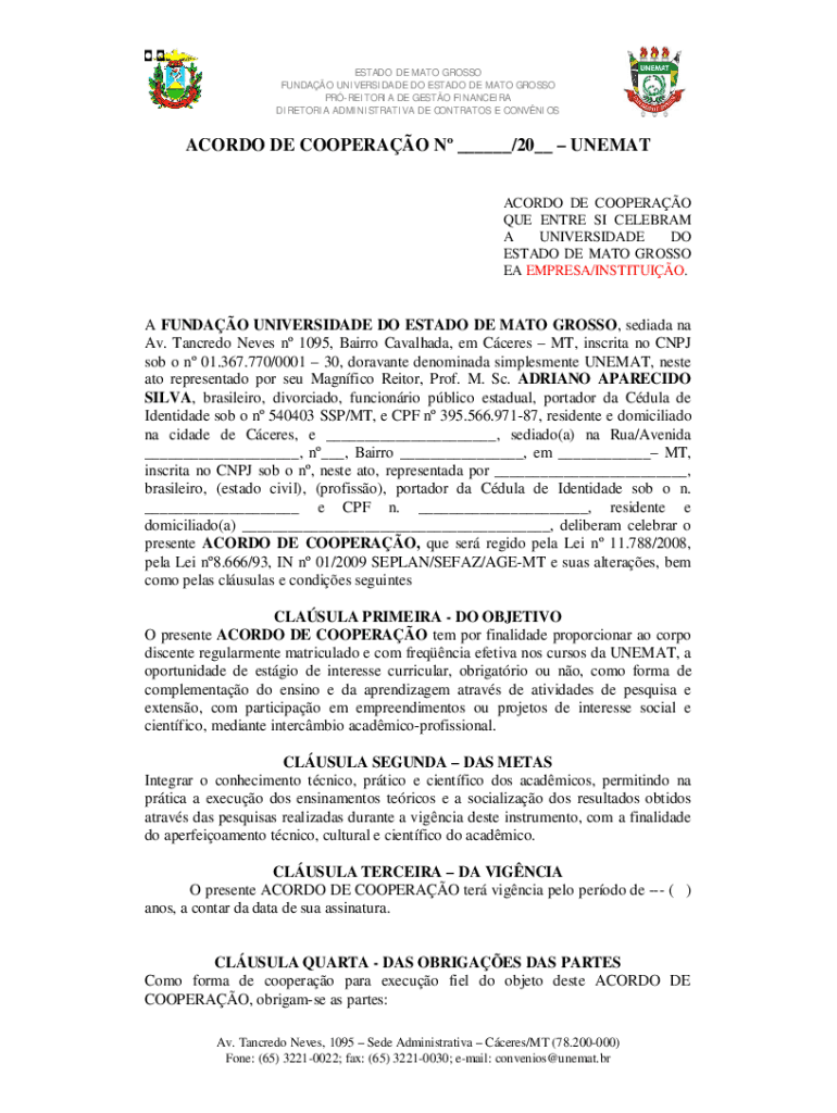 ESTATE DE MATO GROSSO FUND AO UNIVERSIDADE DO ESTATE DE MATO GROSSO PRETORIA DE GUSTO FINANCE IRA DIRECTORIAL ADMINISTRATIVE DE CONTRALTOS E CONVNIOSACORDO DE COOPER AO N ___/20__ NEAT CORD DE COOPER