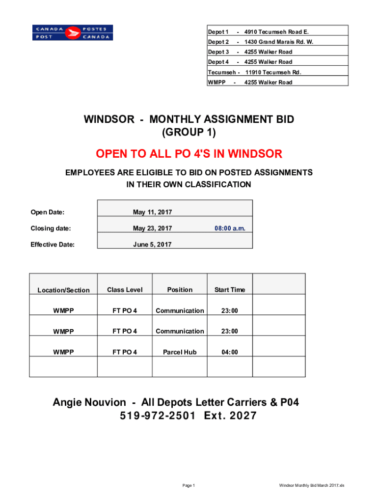 Depot 14910 Tecumseh Road E. Depot 21430 Grand Marie Rd. W. Depot 34255 Walker RoadDepot 44255 Walker Road Tecumseh 11910 Tecumseh Rd.WMPP4255 Walker RoadWINDSOR MONTHLY ASSIGNMENT BID (GROUP 1)OPEN