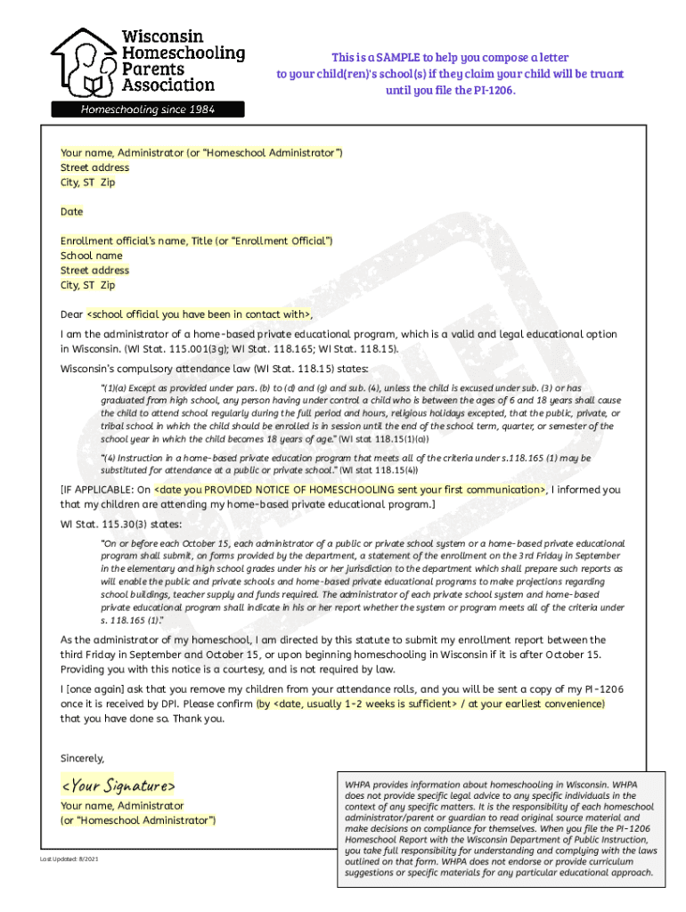 This is a SAMPLE to help you compose a letter to your child(men)\'s school(s) if they claim your child will be truant until you file the PI1206. Your name, Administrator (or Homeschool Administrator)