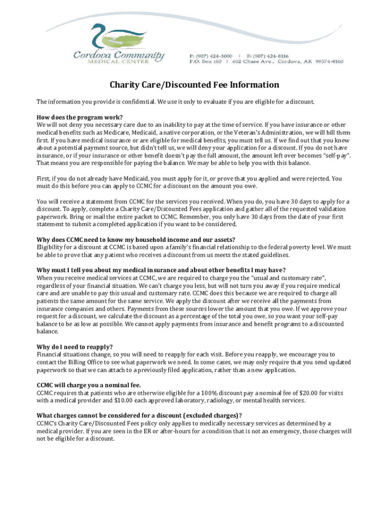 Charity Care/Discounted Fee Information The information you provide is confidential. We use it only to evaluate if you are eligible for a discount. How does the program work? We will not deny you