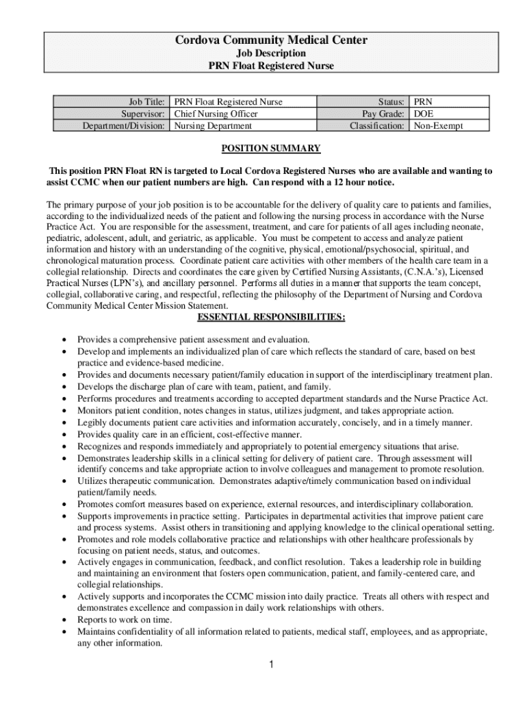 Cordova Community Medical Center Job Description PRN Float Registered Nurse Job Title: PRN Float Registered Nurse Supervisor: Chief Nursing Officer Department/Division: Nursing DepartmentStatus: PRN