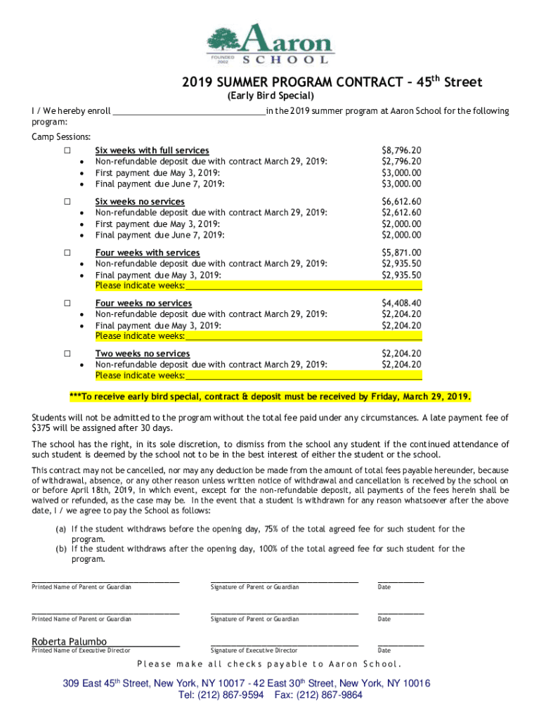2019 SUMMER PROGRAM CONTRACT 45th Street (Early Bird Special) I / We hereby enroll ___in the 2019 summer program at Aaron School for the following program: Camp Sessions: Six weeks with full services