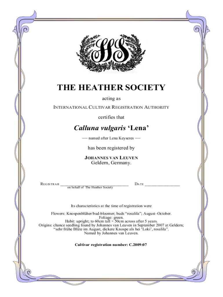 THE HEATHER SOCIETY acting as INTERNATIONAL CULTIVAR REGISTRATION AUTHORITY certifies thatCalluna vulgarism Lena named after Lena Easier has been registered by JOHANNES VAN LEUVEN Golden, Germany.
