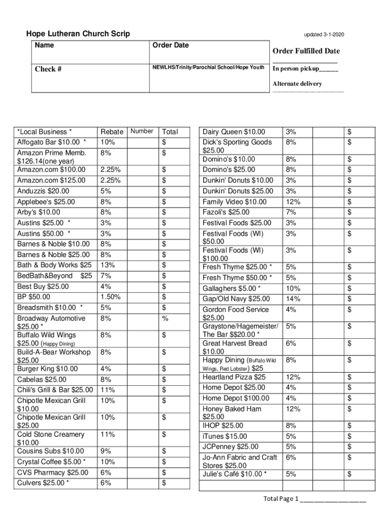 Hope Lutheran Church Scrip updated 312020NameOrder Hatcheck #NEW LHS/Trinity/Parochial School/Hope Southerner Fulfilled Date ___ In person pickup___ Alternate delivery ___*Local Business * Afloat