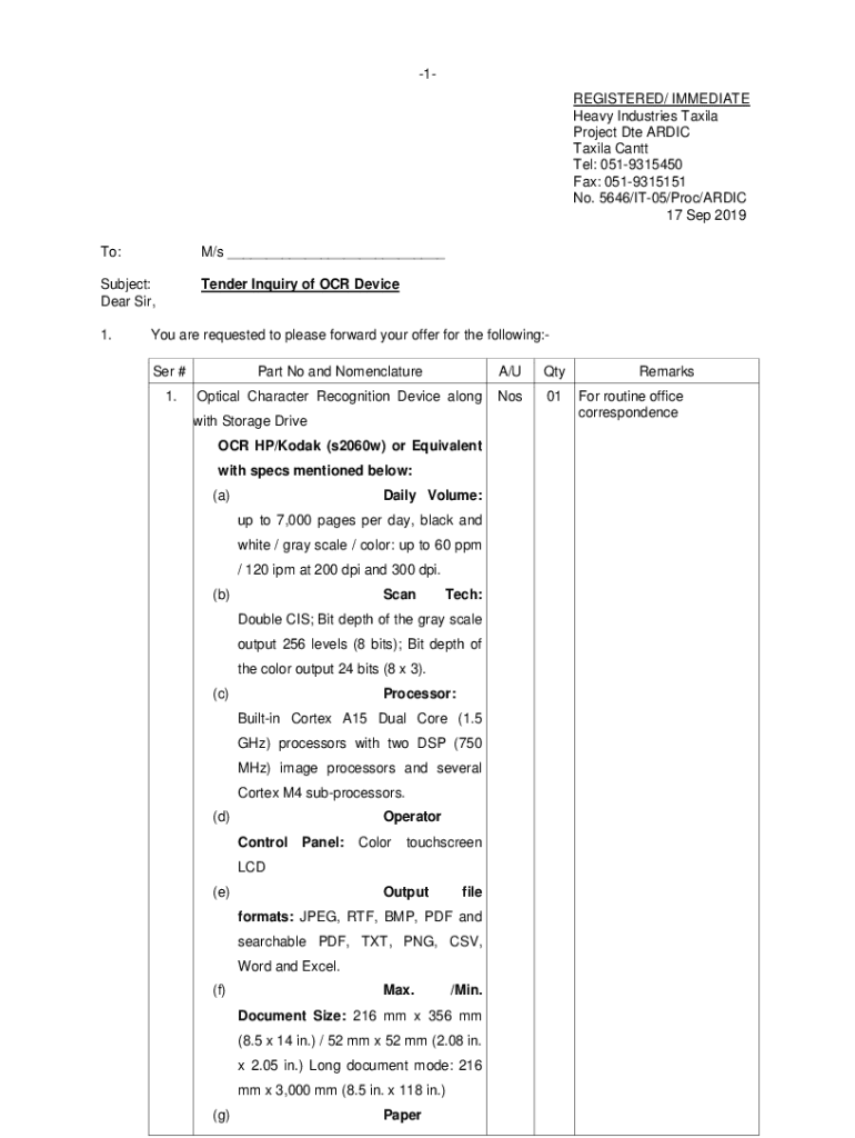 1REGISTERED/ IMMEDIATE Heavy Industries Taxi la Project Due BARDIC Taxi la Canto Tel: 0519315450 Fax: 0519315151 No. 5646/IT05/Pro/BARDIC 17 Sep 2019 To’M/s ___Subject: Dear Sir, Tender Inquiry
