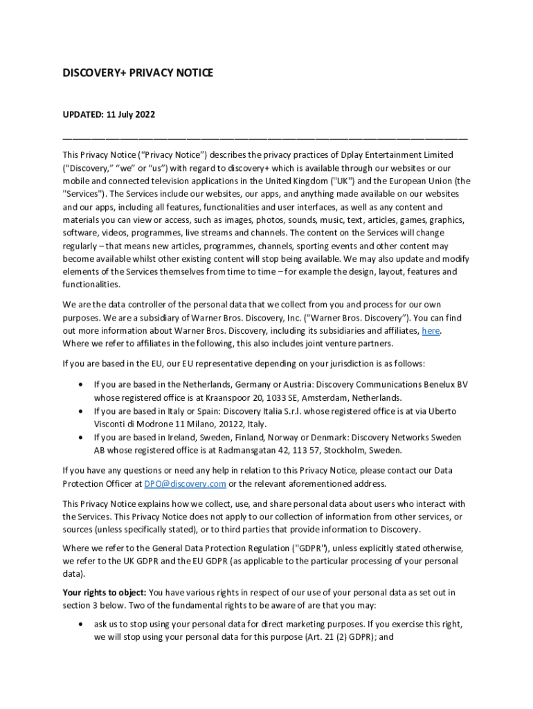 DISCOVERY+ PRIVACY NOTICE UPDATED: 11 July 2022 ___ This Privacy Notice (Privacy Notice) describes the privacy practices of Play Entertainment Limited (Discovery, we or us) with regard to discovery+