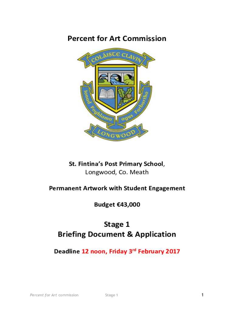 Percent for Art Commissions. Fontinas Post Primary School, Longwood, Co. Death Permanent Artwork with Student Engagement Budget 43,000Stage 1 Briefing Document & Application Deadline 12 noon, Friday