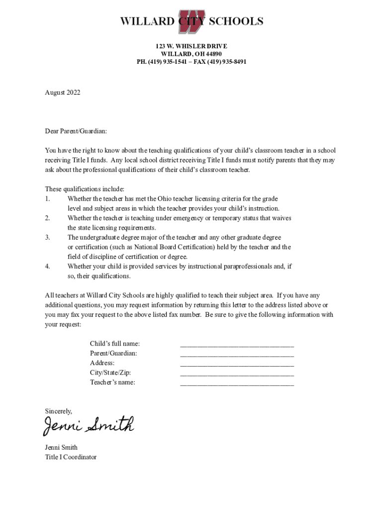 123 W. WHISTLER DRIVE WILLARD, OH 44890 PH. (419) 9351541 FAX (419) 9358491August 2022Dear Parent/Guardian: You have the right to know about the teaching qualifications of your children classroom