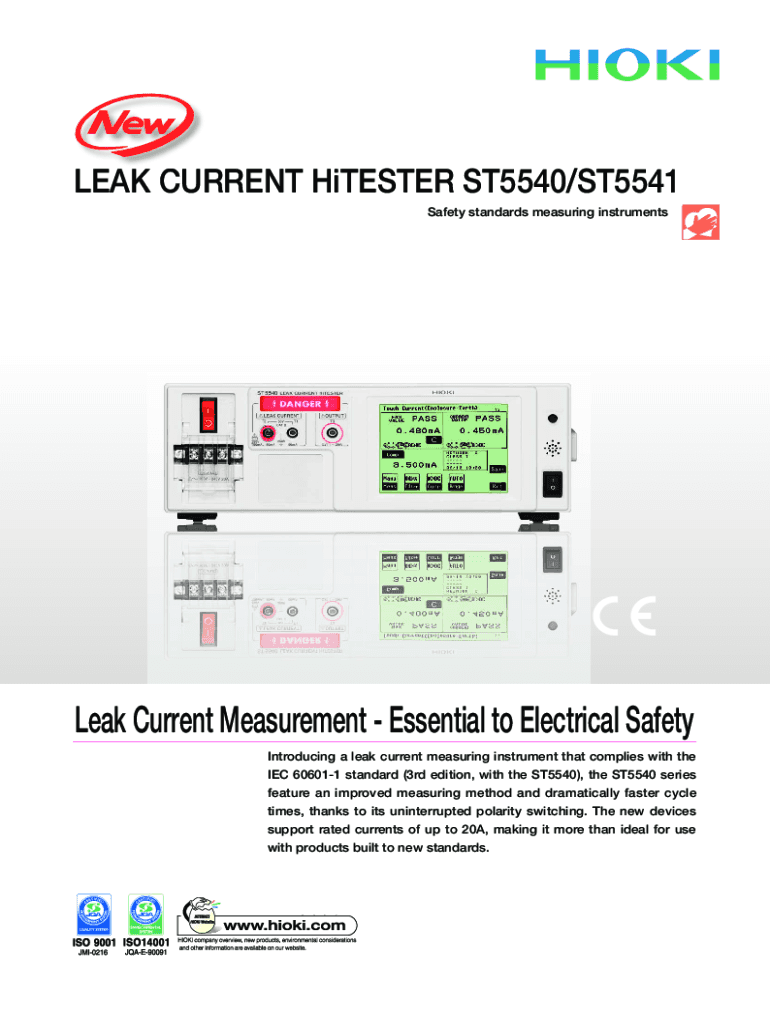 LEAK CURRENT Hitter ST5540/ST5541 Safety standards measuring instrumentsLeak Current Measurement Essential to Electrical Safety Introducing a leak current measuring instrument that complies with the