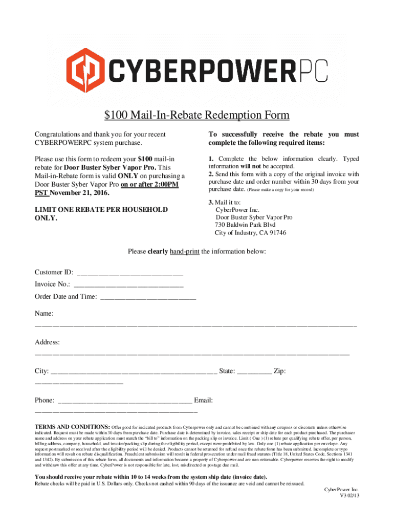 $100 MailInRebate Redemption Form Congratulations and thank you for your recent CYBERPOWERPC system purchase. To successfully receive the rebate you must complete the following required items:Please