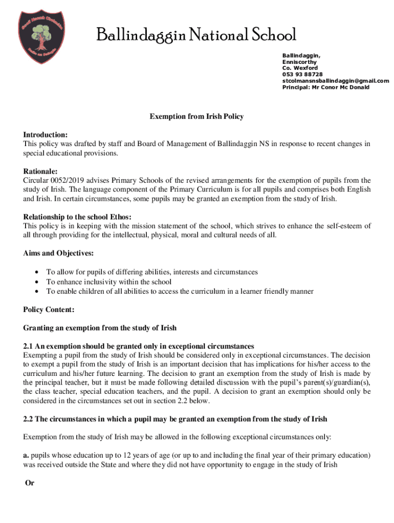 Ballindaggin National School Ballindaggin, Enniscorthy Co. Oxford 053 93 88728 stcolmansnsballindaggin@gmail.com Principal: Mr Conor MC DonaldExemption from Irish Policy Introduction: This policy