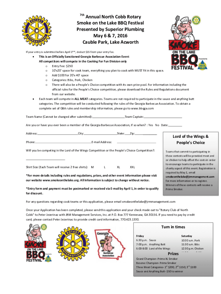 7thAnnual North Cobb Rotary Smoke on the Lake BBQ Festival Presented by Superior Plumbing May 6 & 7, 2016 Cable Park, Lake Ac worth If your entry is submitted before April 1**, deduct $15 from your