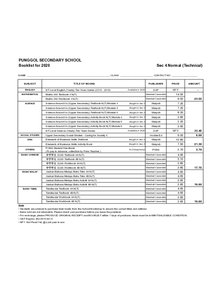 Book list for 2020Sec 4 Normal (Technical)NAME: ___ CLASS: ___ CONTACT NO: ___