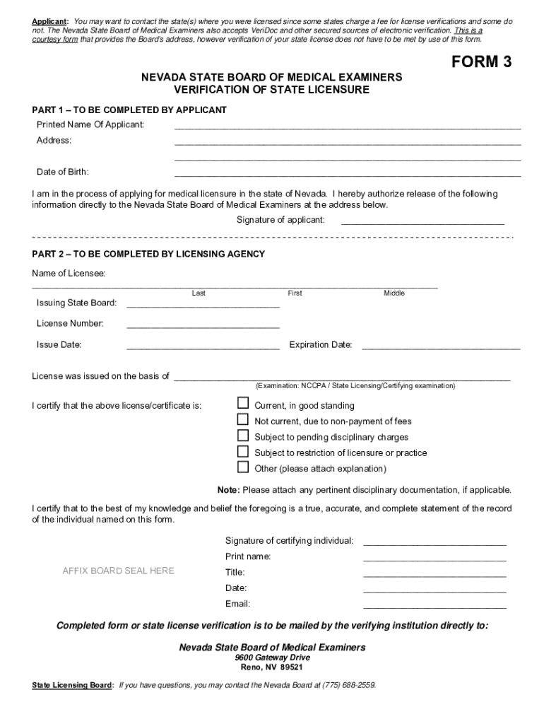 Applicant: You may want to contact the state(s) where you were licensed since some states charge a fee for license verifications and some do not. The Nevada State Board of Medical Examiners also accepts