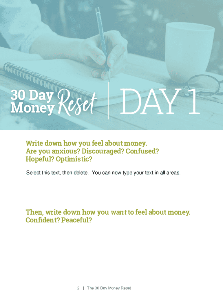THE30 Day MoneyReset30 Day Minaret DAY 1Write down how you feel about money. Are you anxious? Discouraged? Confused? Hopeful? Optimistic? Select this text, then delete. You can now type your text