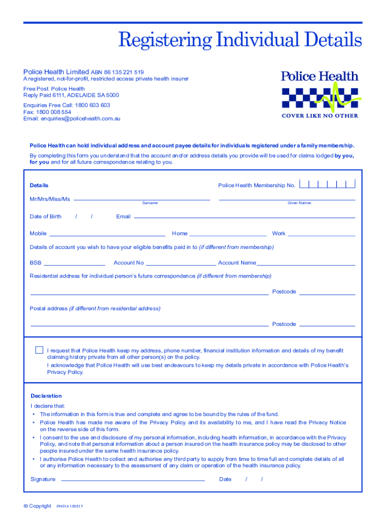 Registering Individual Details Police Health Limited ABN 86 135 221 519A registered, notforprofit, restricted access private health insurer Free Post: Police Health Reply Paid 6111, ADELAIDE SA 5000