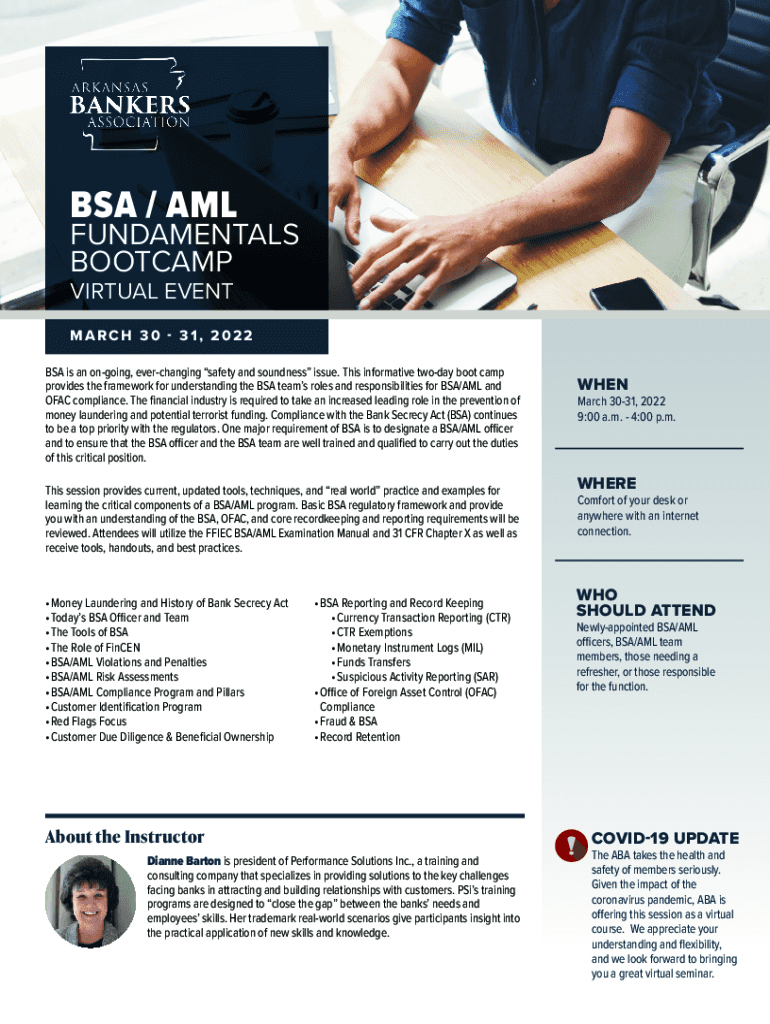 BSA / FUNDAMENTALS BOOKCASE VIRTUAL EVENTMARCH 30 31, 2022 BSA is an ongoing, ever-changing safety and soundness issue. This informative today boot camp provides the framework for understanding the