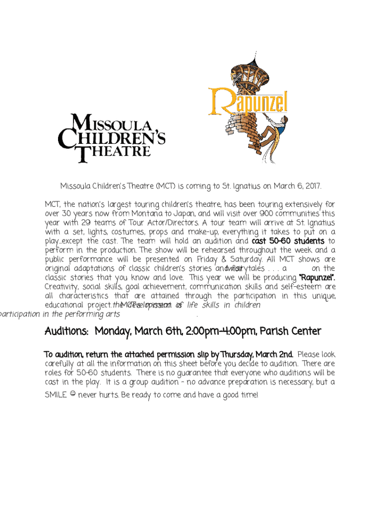Missoula Children\'s Theater (MCT) is coming to St. Ignatius on March 6, 2017.MCT, the nations the largest touring children's theater, has been touring extensively for over 30 years now from Montana