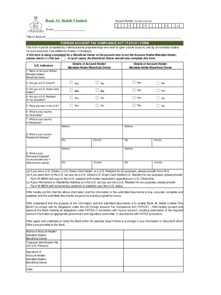 Bank AL Habit Limited BranchAccount Number (For Bank Use Only)___Title of Account ___FOREIGN ACCOUNT TAX COMPLIANCE ACT (\” FATWA\”) FORM This form must be completed by individuals/sole proprietorship