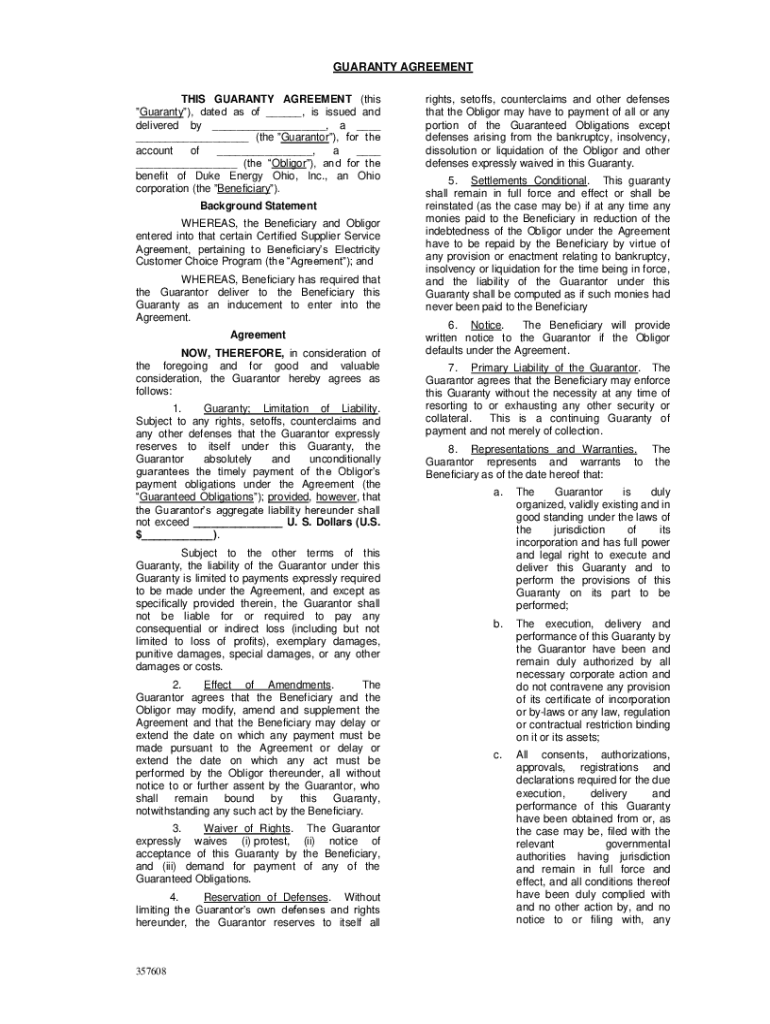 GUARANTY AGREEMENT THIS GUARANTY AGREEMENT (this Guaranty), dated as of ___, is issued and delivered by ___, a ___ ___ (the Guarantor), for the account of ___, a ___ ___ (the Obliged), and for the