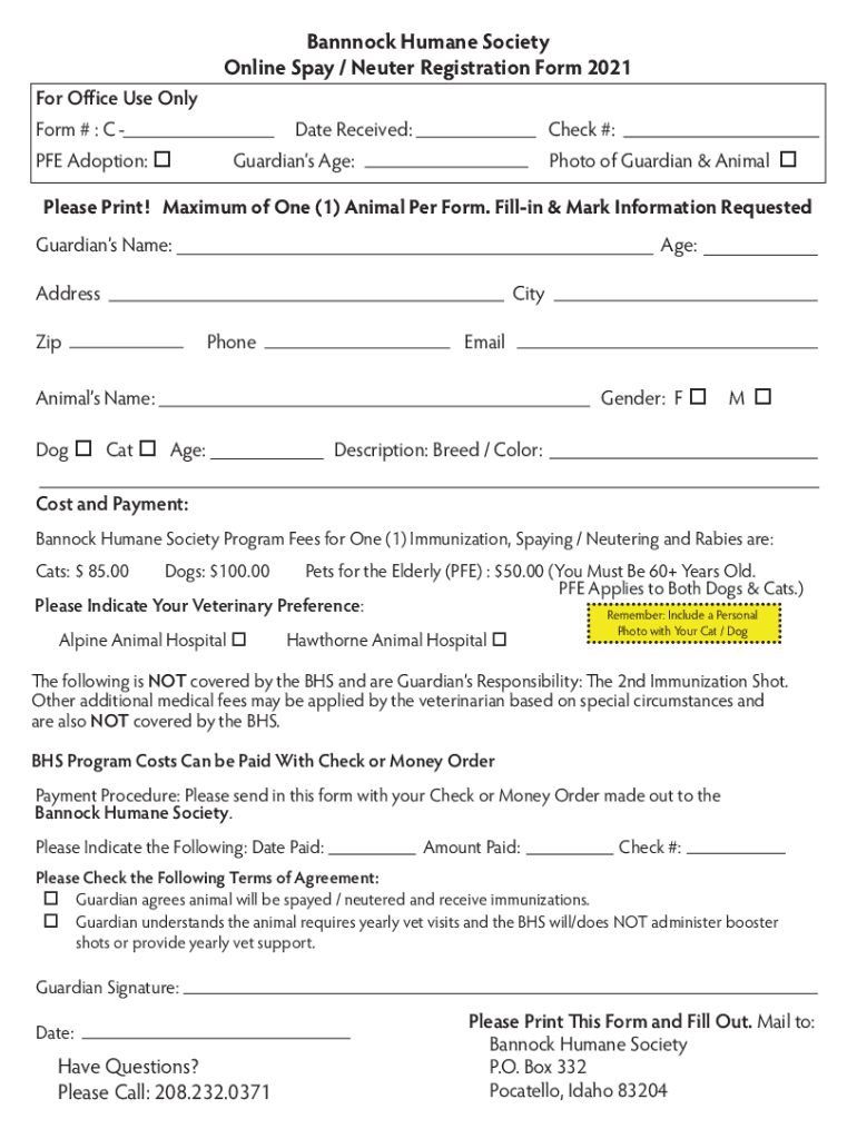 Bannock Humane Society Online Spay / Neuter Registration Form 2021 For Office Use Only Form # : C PFE Adoption: date Received: Guardians Age:Check #: Photo of Guardian & Animal please Print! Maximum
