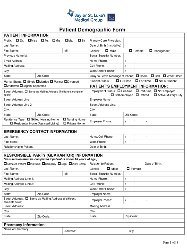 Patient Demographic Formation INFORMATION Prefix: Dr. Miss Mr. Mrs. Ms. Sibilant Name: First Name: Previous Name(s):Primary Care Physician: Date of Birth (mm/dd/by)Ml:Gender:MaleFemaleSocial Security