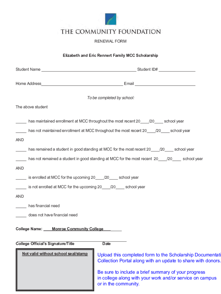 RENEWAL FORM Elizabeth and Eric Rennet Family MCC Scholarship Student Name ___ Student ID# ___ Home Address___ Email ___To be completed by school: The above student ___ has maintained enrollment at