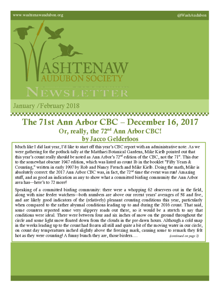 WWW.washtenawaudubon.org@WashAudubonJanuary /February 2018The 71st Ann Arbor CBC December 16, 2017,