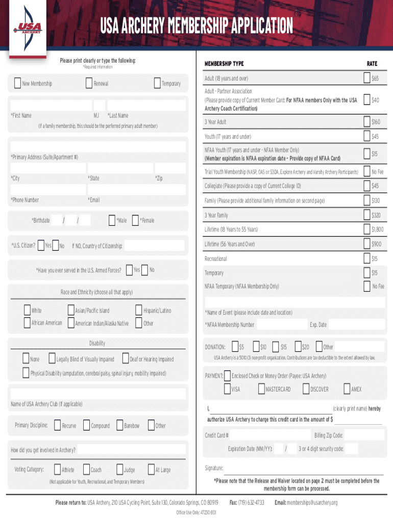 USA ARCHERY MEMBERSHIP APPLICATION Please print clearly or type the following:MEMBERSHIP TYPE×Required Information MembershipRenewal×First Name. Temporary×Last Name(If a family membership, this