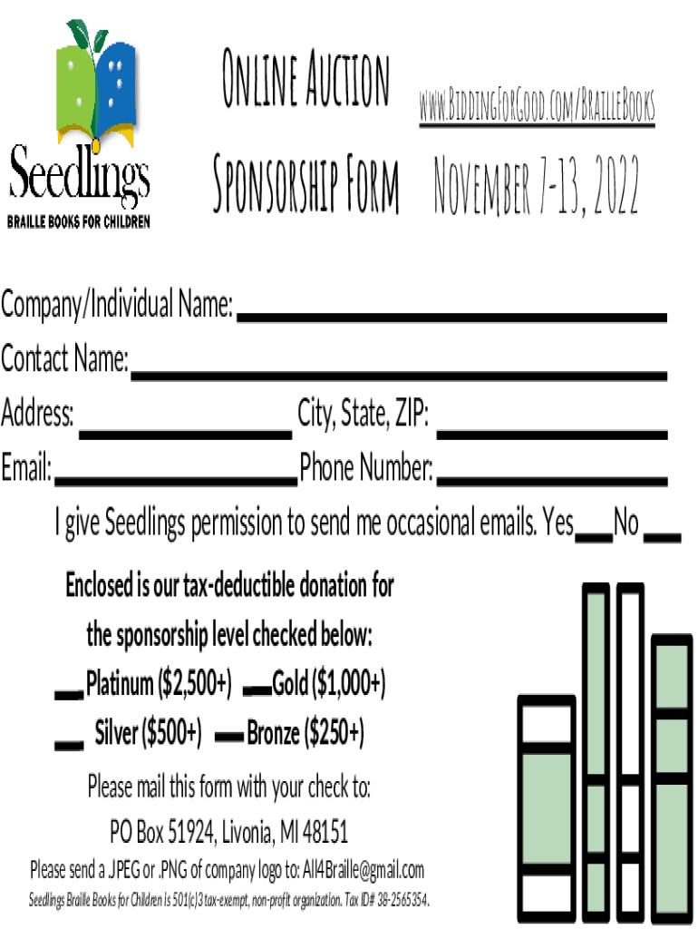 Online Auction www.BiddingForGood.com/BrailleBooks Sponsorship Form November 713, 2022 Company/Individual Name: Contact Name: Address: City, State, ZIP: Email: Phone Number: I give Seedlings permission