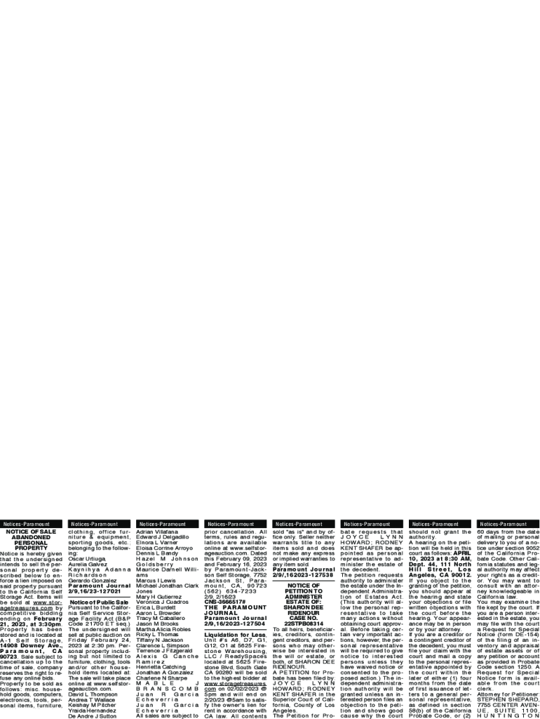 Notices Paramount NOTICE OF SALE ABANDONED PERSONAL PROPERTY Notice is hereby given that the undersigned intends to sell the personal property described below to enforce a lien imposed on said property