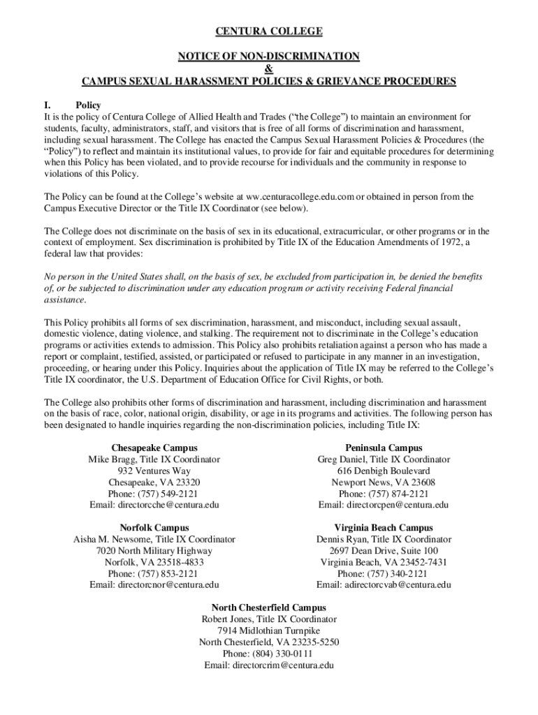 CENTURY COLLEGE NOTICE OF NONDISCRIMINATION & CAMPUS SEXUAL HARASSMENT POLICIES & GRIEVANCE PROCEDURES I. Policy It is the policy of Century College of Allied Health and Trades (the College) to maintain