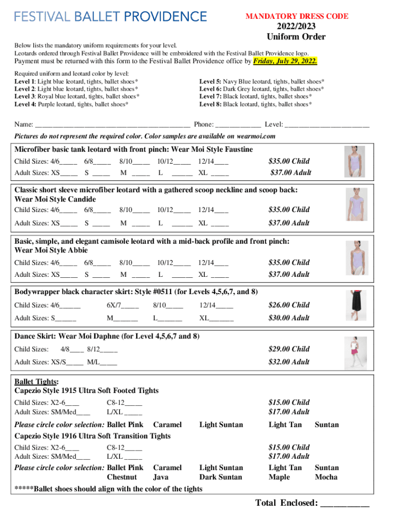 MANDATORY DRESS CODE2022/2023 Uniform Order Below lists the mandatory uniform requirements for your level. Leotards ordered through Festival Ballet Providence will be embroidered with the Festival