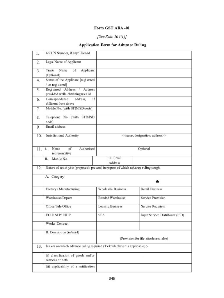 Form GST ARA 01 [See Rule 104(1)] Application Form for Advance Ruling 1.GTIN Number, if any/ Userid2. Legal Name of Applicant3. Trade Name of Applicant (Optional) Status of the Applicant [registered