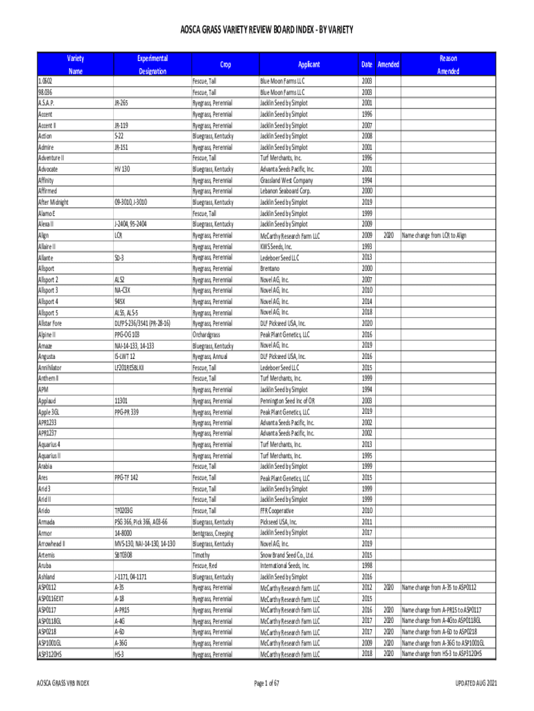 TOSCA GRASS VARIETY REVIEW BOARD INDEX BY VARIETY Name1.0602 98.036 A.S.A.P. Accent II Action Admire Adventure II Advocate Affinity Affirmed After Midnight Alamo E Alexa II Align Alleged II All ante