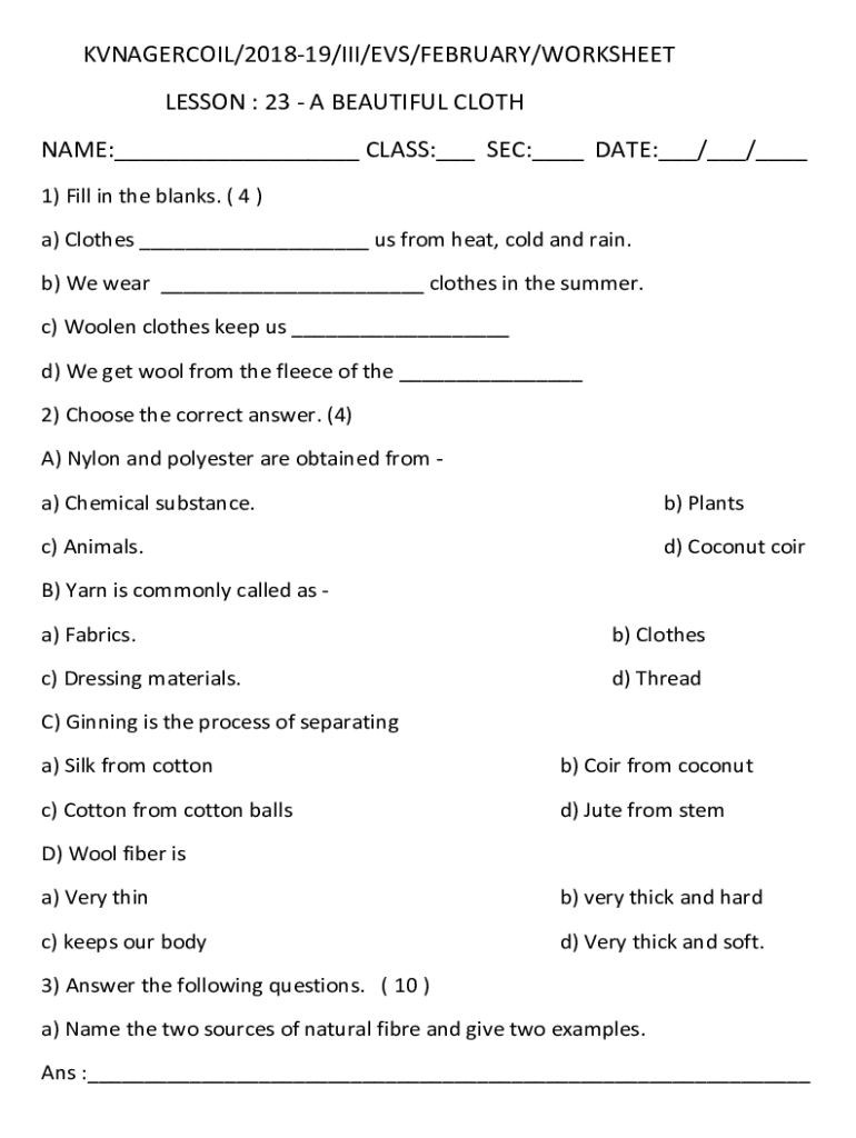 KVNAGERCOIL/201819/III/EVS/FEBRUARY/WORKSHEET LESSON : 23 A BEAUTIFUL CLOTH NAME:___ CLASS:___ SEC:___ DATE:___/___/___ 1) Fill in the blanks. (4) a) Clothes ___ us from heat, cold and rain. b) We