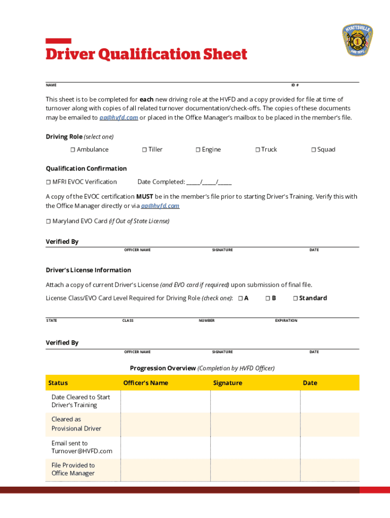 Driver Qualification Sheet NAMED #This sheet is to be completed for each new driving role at the HAD and a copy provided for file at time of turnover along with copies of all related turnover documentation/checkoffs.