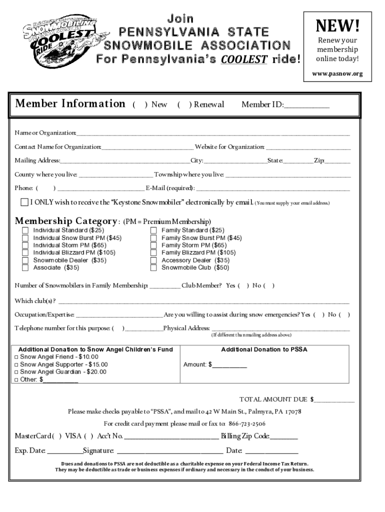Join PENNSYLVANIA STATE SNOWMOBILE ASSOCIATION For Pennsylvania's COOLEST ride!NEW! Renew your membership online today!www.pasnow.orgMember In formation () New () Renewal Member ID:___ Name or Organization:___Contact