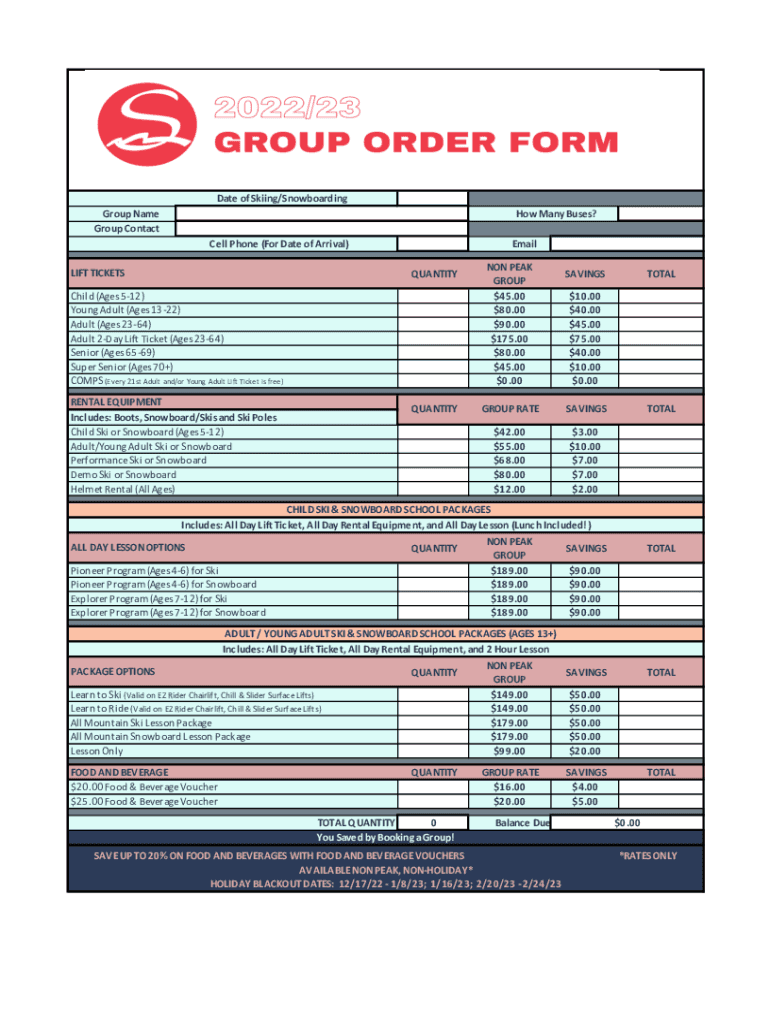 Date of Skiing/Snowboarding Group Name Group Contactor Many Buses? Cell Phone (For Date of Arrival)LIFT TICKETSEmail QUANTITYChild (Ages 512) Young Adult (Ages 1322) Adult (Ages 2364) Adult 2Day Lift