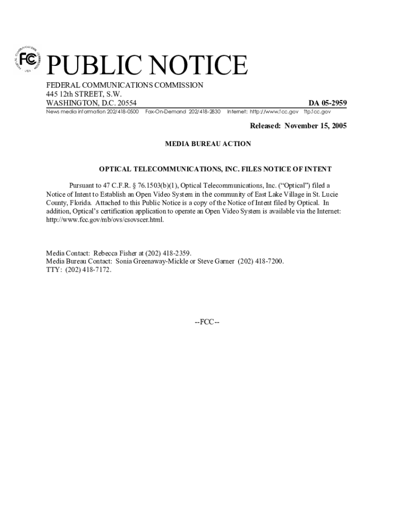 PUBLIC NOTICE FEDERAL COMMUNICATIONS COMMISSION 445 12th STREET, S.W. WASHINGTON, D.C. 20554 News media information 202/4180500FaxOnDemand 202/4182830DA 052959 Internet: http://www.fcc.govftp.fcc.govReleased: